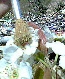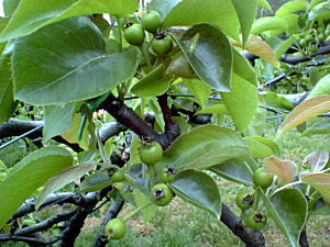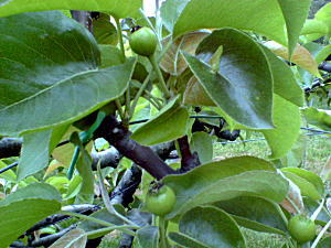 これは、5月の梨の実です。10個程度のサクランボ大の大きさの実を摘果し